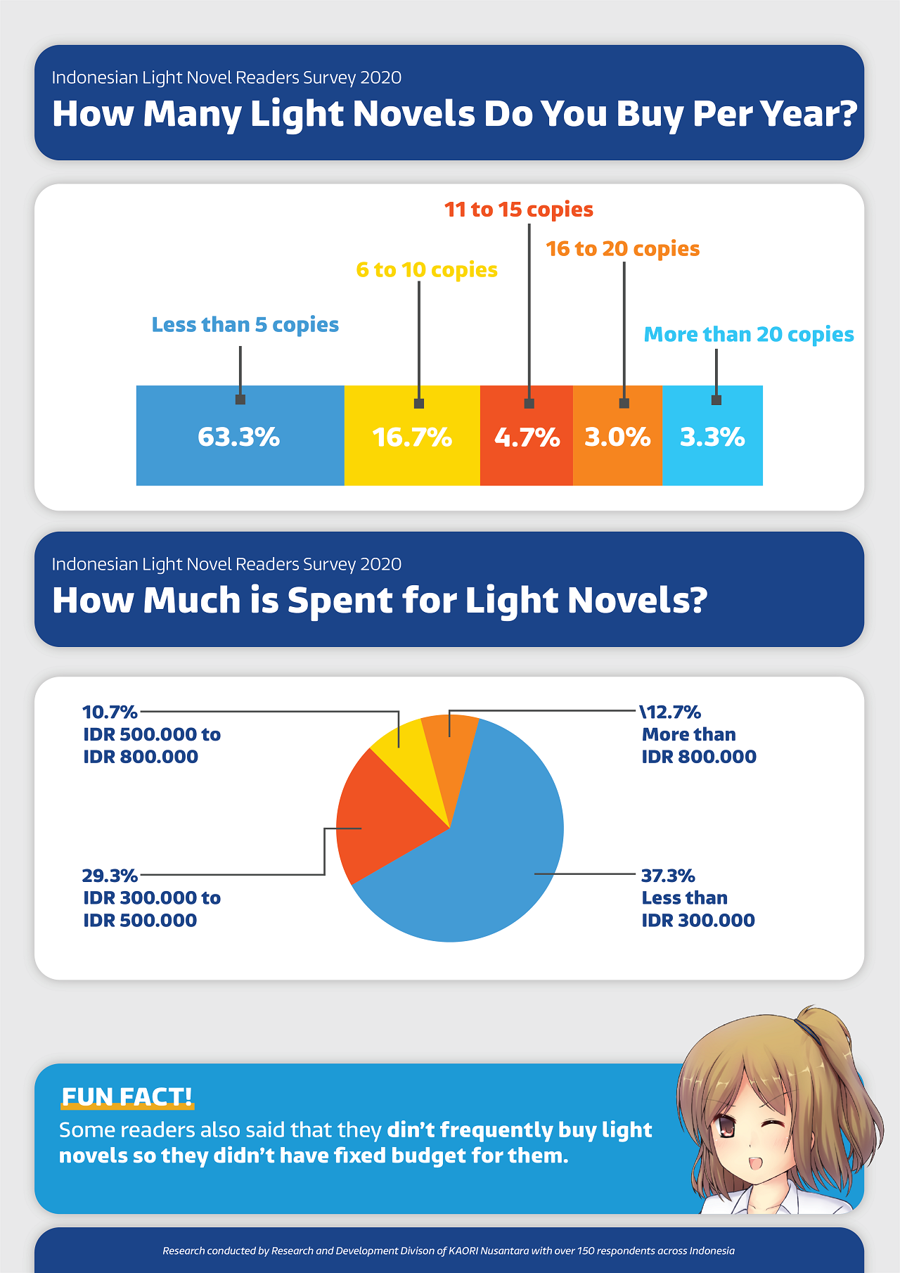 We also asked the amount of money spent for light novels. The majority of the respondents spent no more than IDR 500,000 (less than US$ 35) per year.
