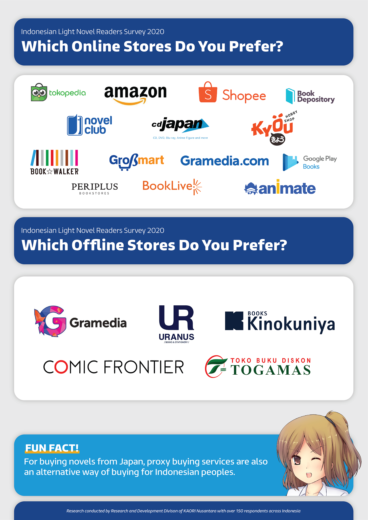 Moving on to physical stores, the major book retailer Gramedia was the most popular choice for getting Indonesian editions, with 62 respondents mentioning it, while Kinokuniya was the most popular choice for getting imported English or Japanese editions with 20 respondents mentioning it (one of which was a resident of Batam who could go to Kinokuniya stores in Singapore or Malaysia). Another popular domestic store was Togamas Bookstore, mentioned by five respondents, and five respondents mentioned other bookstores like Gunung Agung, or Uranus. One respondent mentioned buying books from vendors who opened shops at Comic Frontier.