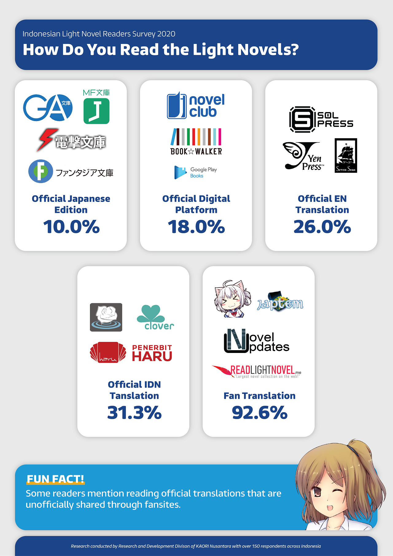 From the result of the survey, we can see that although the availability of light novels from Indonesian publishers is still limited, the respondents were still able to consume various light novel series by utilizing a mixed selection of channels, both official and unofficial; whether they’re the few titles that were available from Indonesian publishers, imported English or Japanese editions, or fan translations. Although some smaller Indonesian publishers like Shining Rose Media and Katalis Pustaka are no longer active, now that a major publisher has moved to publishing popular light novel titles, it would be interesting to observe if this will have a significant impact on the habits of fans in reading light novels.