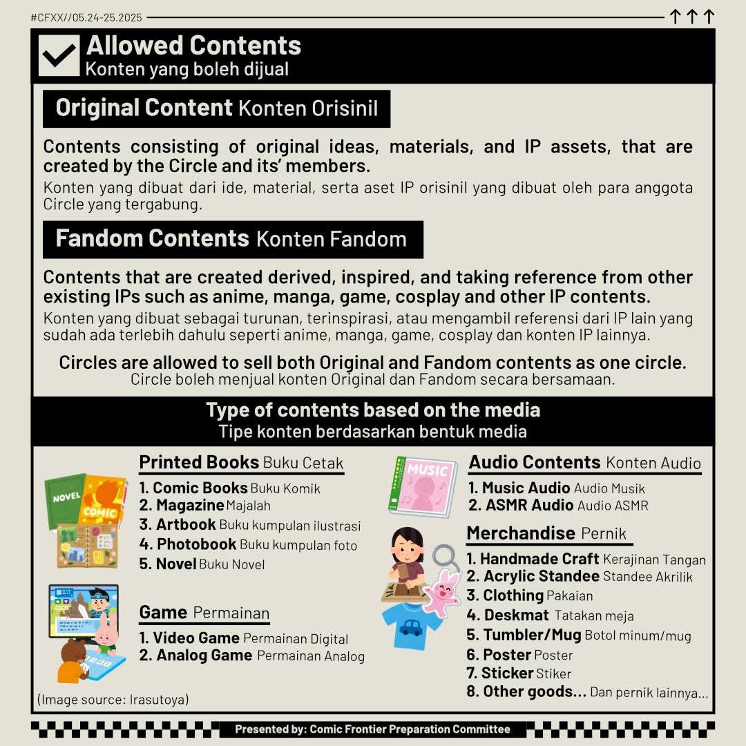 - Commercially mass-produced official goods from other IPs that are not owned and not produced by the circle members, such as idol photos, toys, or similar goods.