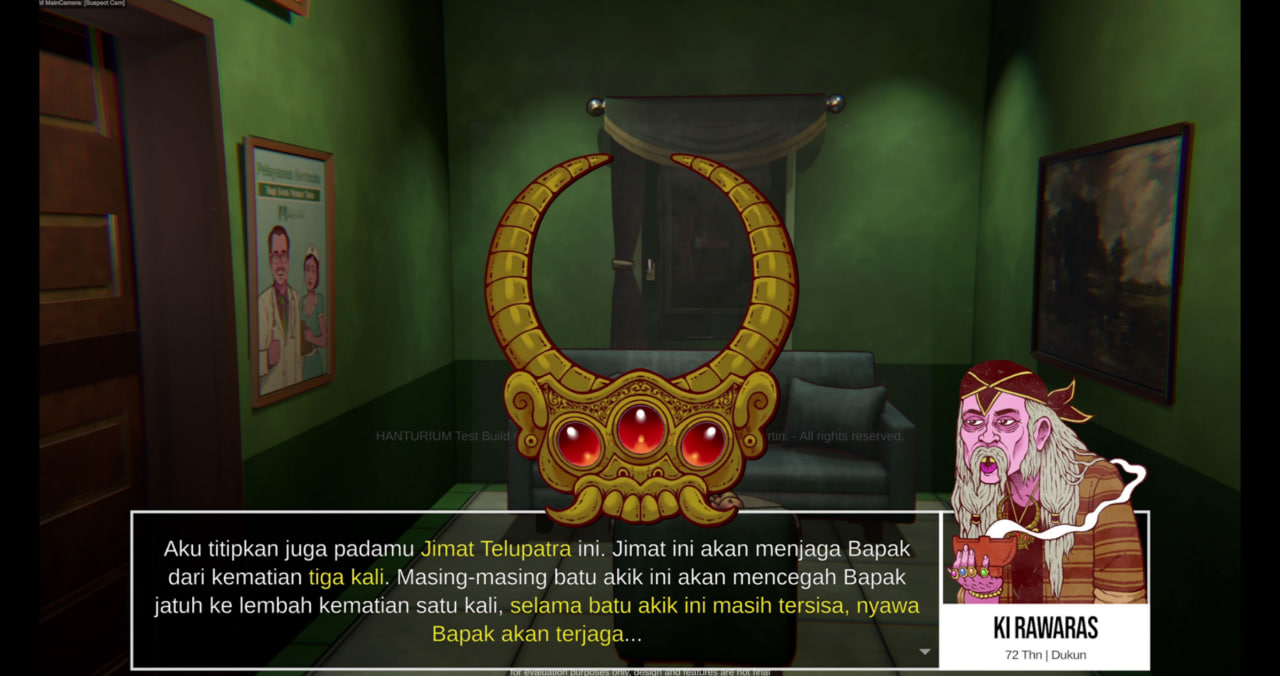 Hanturium tells the story of Ida, a nurse who works in Mertahita Hospital. She is tasked with caring for a wealthy patient whose unexplained symptoms trigger supernatural events and family intrigue. Gameplay revolves around investigating paranormal anomalies, reviewing medical and spiritual records, and monitoring life support equipment, with time pressure adding to the tension. Dialogue and character interactions are central to uncovering the truth.