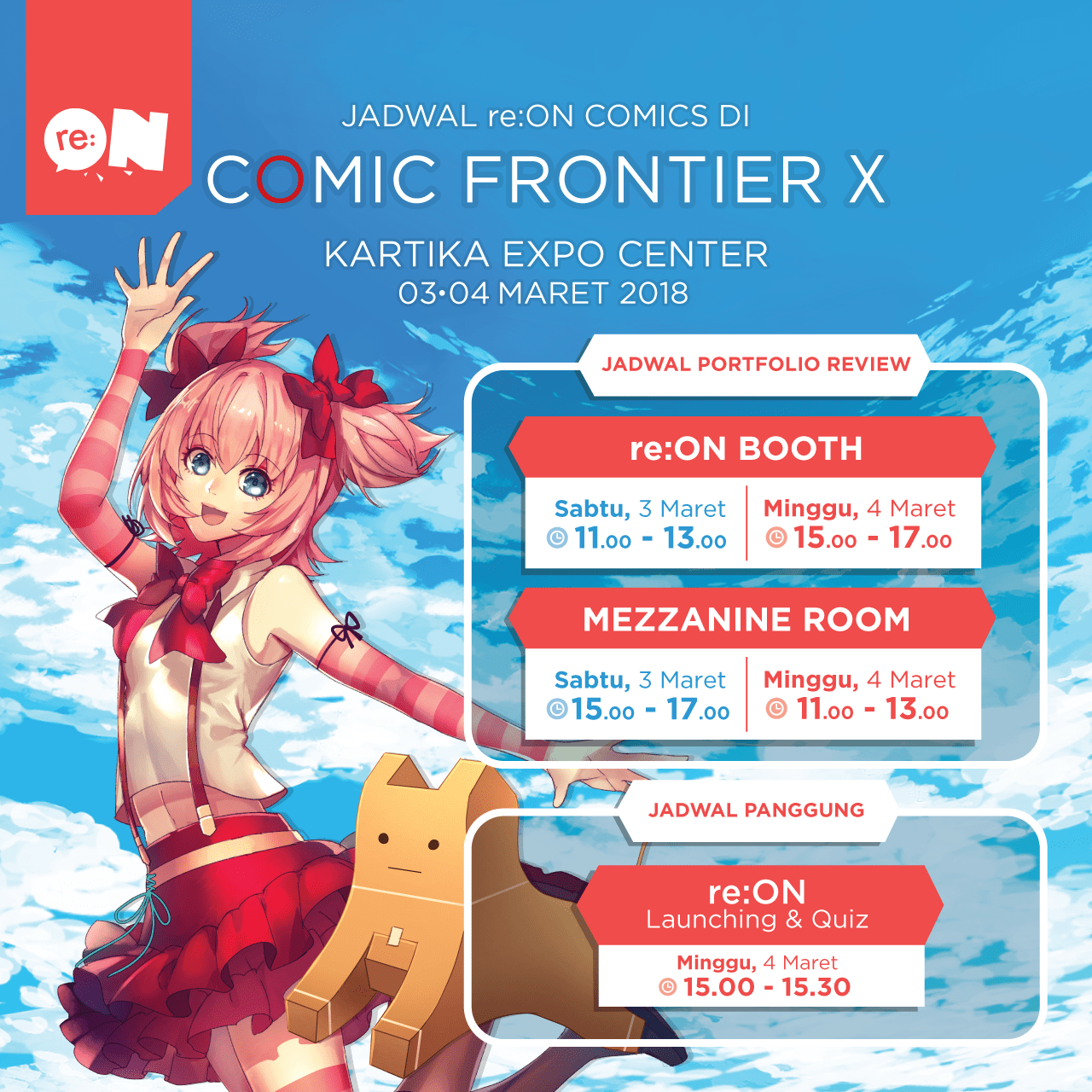 Untuk pertama kalinya, Comic Frontier X kali ini akan menghadirkan sebuah Portofolio Review. Dalam Portofolio Review ini, para kreator bisa menunjukkan berbagai hasil karya kreatifnya kepada sejumlah penerbit yang hadir di acara ini. Berbagai penerbit yang akan hadir mengisi sesi Portofolio Review ini adalah Well+Done Group, Penerbit Haru, CIAYO Comics, Re:ON Comics, dan Comico.