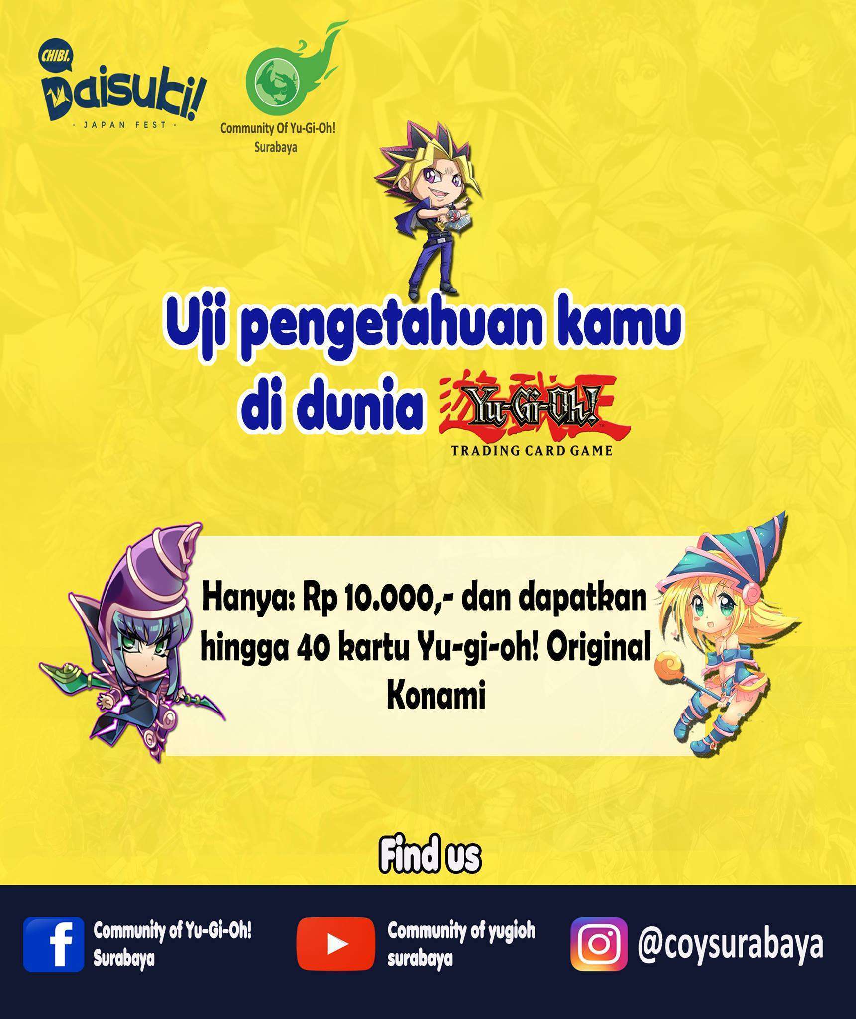 Selain bintang tamu, acara Chibi Daisuki juga semakin ramai dengan berbagai stand komunitas jejepangan dari Surabaya dan wilayah sekitar Jawa Timur. Mulai dari Pokemon, Tekken, Yu-Gi-Oh, hingga Girls Frontline! Mereka juga akan hadir dengan berbagai kegiatan seru dan tak kalah menarik! Ini dia beberapa komunitas yang akan muncul di Chibi Daisuki.