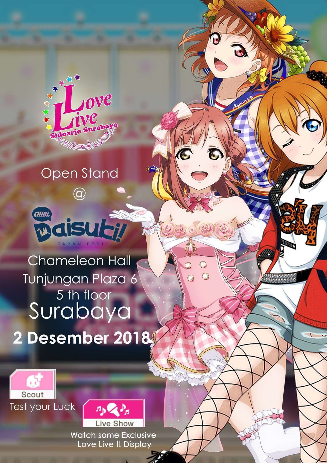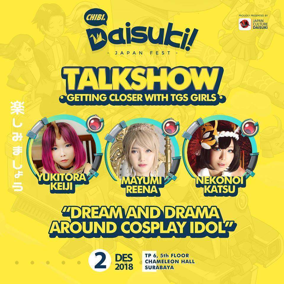 Anda tinggal di Surabaya dan sedang menantikan acara jejepangan pada awal Desember nanti? EO Japan Culture Daisuki menyelenggarakan event bertajuk Chibi Daisuki pada tanggal 2 Desember 2018 mendatang. Acara yang akan digelar di Tunjangan Plaza 6 Lt. 5 ini akan menghadirkan berbagai konten yang pastinya akan memuaskan para penikmat jejepangan yang ada di Kota Pahlawan dan sekitarnya. HTM untuk pembelian on the spot (OTS) dijual seharga 30 ribu rupiah untuk kelas reguler dan 70 ribu rupiah untuk kelas spesial.
