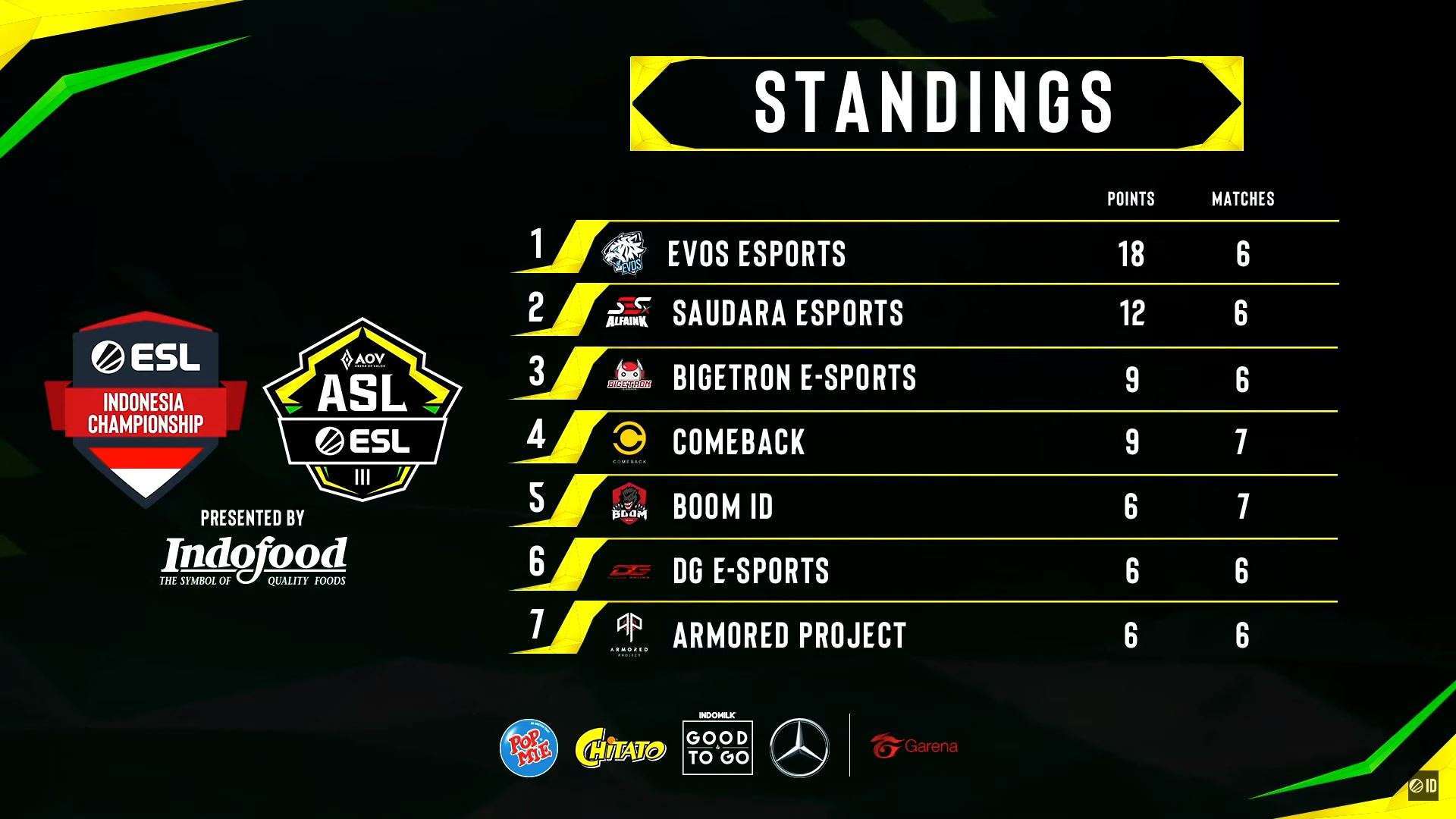 Saksikan terus seluruh pertandingan ASL ID S3 by ESL, yang dipersembahkan oleh Indofood dengan Chitato,