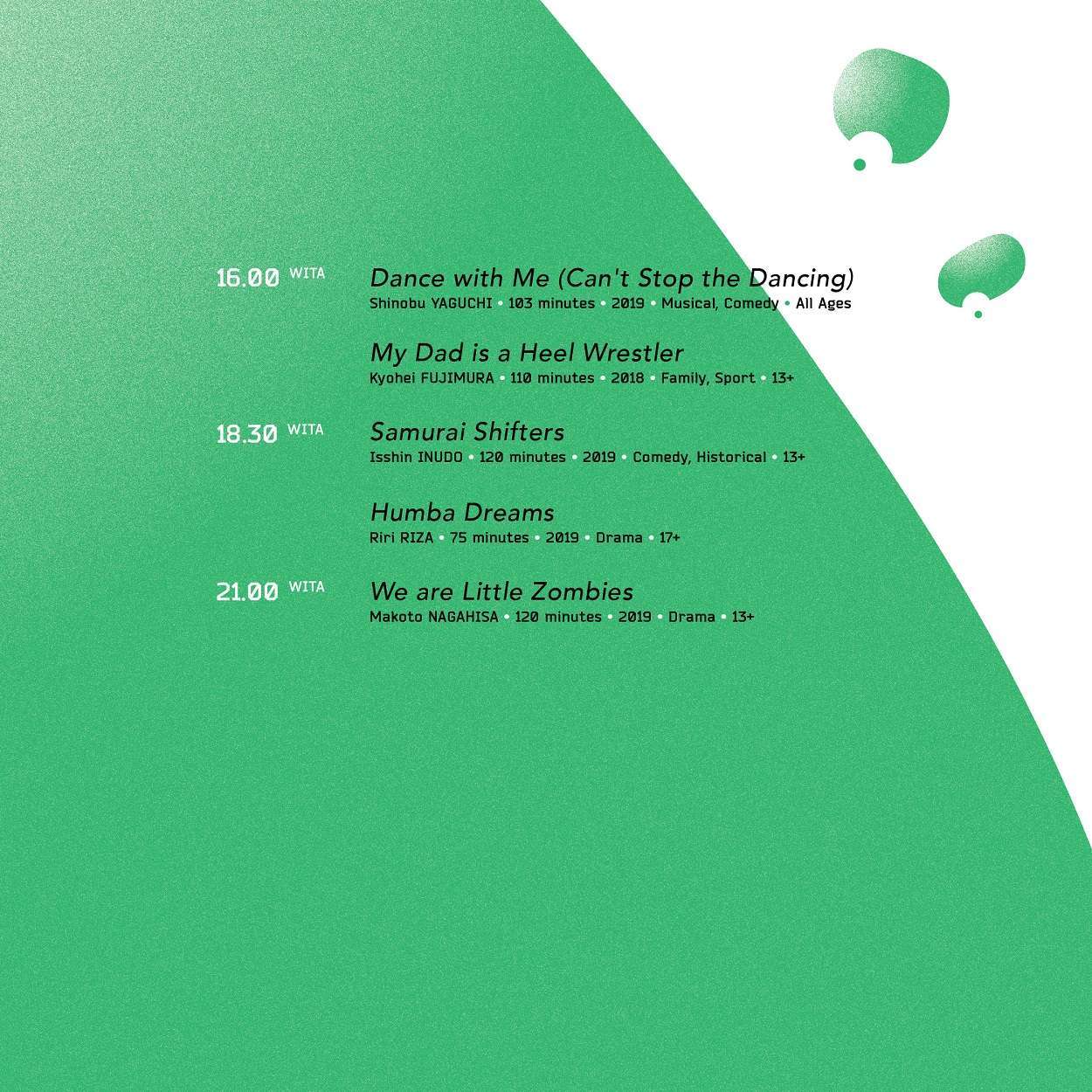 JFF kali ini menayangkan “We Are Little Zombies”, sebuah film bergenre drama musik garapan Makoto Nagahisa yang memiliki estektik tidak biasa. Film tersebut telah mendapatkan penghargaan World Dramatic Special Jury Award untuk Orisinalitas di Sundance Film Festival, dan telah diputar di Berlin International Film Festival 2019, Buenos Aires International Festival of Independent Cinema 2019, Fantasia Film Festival 2019, dan Sitges – Catalonian International Film Festival 2019. Selain itu, ada pula “Dance with Me” karya Shinobu Yaguchi. Film komedi musikal ini pun telah mendapatkan Audience Award di Toronto Japanese Festival dan Audience Silver Award di Fantasia Film Festival.