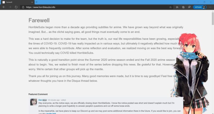 Sebuah era telah berlalu. Pada hari Jumat (2/10) siang waktu Indonesia bagian barat, kabar duka datang dari sebuah sudut internet. Horriblesubs, situs anime bajakan terbesar berbahasa Inggris yang memuat ulang video dari penyedia strim legal, mengakhiri kiprahnya.