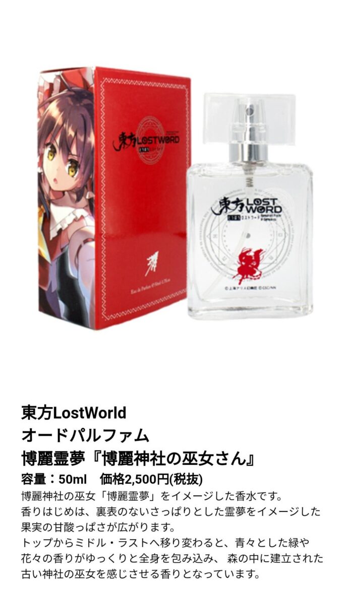 Gim smartphone Touhou Project Lost World, bekerja sama dengan Fairy Tail Perfume dengan merilis 5 parfum yang terinspirasi dari beberapa karakter Touhou. Ada pun karakter tersebut adalah Reimu Hakurei, Marisa Kirisame, Cirno, serta kakak beradik, Remilia dan Flandre Scarlet.