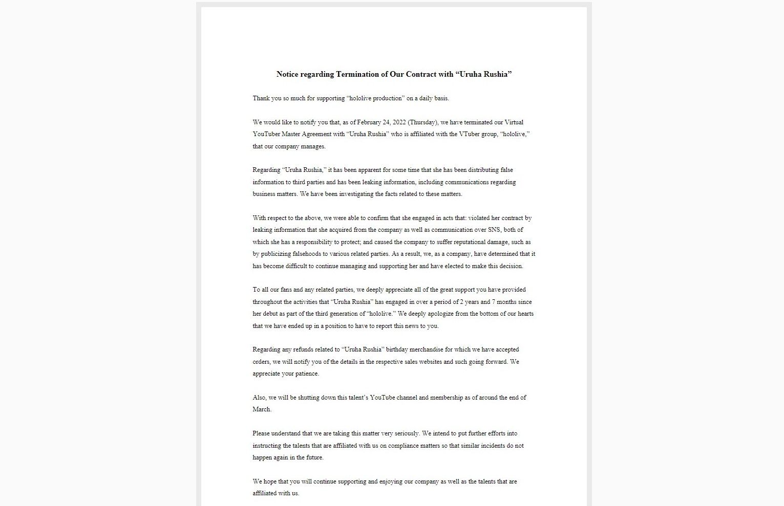 Notice regarding Termination of Our Contract with “Uruha Rushia”