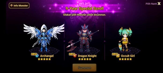 Pertama, para pemain bisa summon hingga 9 Monster Bintang 5 dengan 9-Year Coin yang mereka dapatkan dan memilih salah satunya di Event Summon Monster Bintang 5. Pemain juga bisa summon Monster Fire/Wind/Water Bintang 4 dan Monster Light/Dark Bintang 3 setiap kali mengumpulkan 50 9-Year Coin.