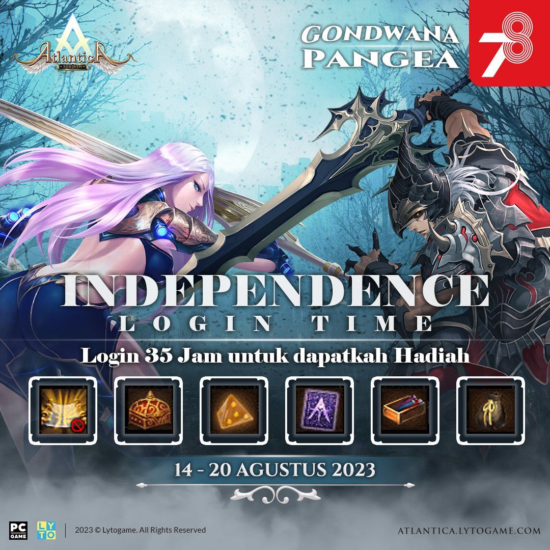 Di event Independence Login Time, Atlantian yang login minimal 35 jam selama periode event berlangsung untuk server Pangea dan Gondwana, akan mendapatkan hadiah menarik tanpa diundi, yaitu: