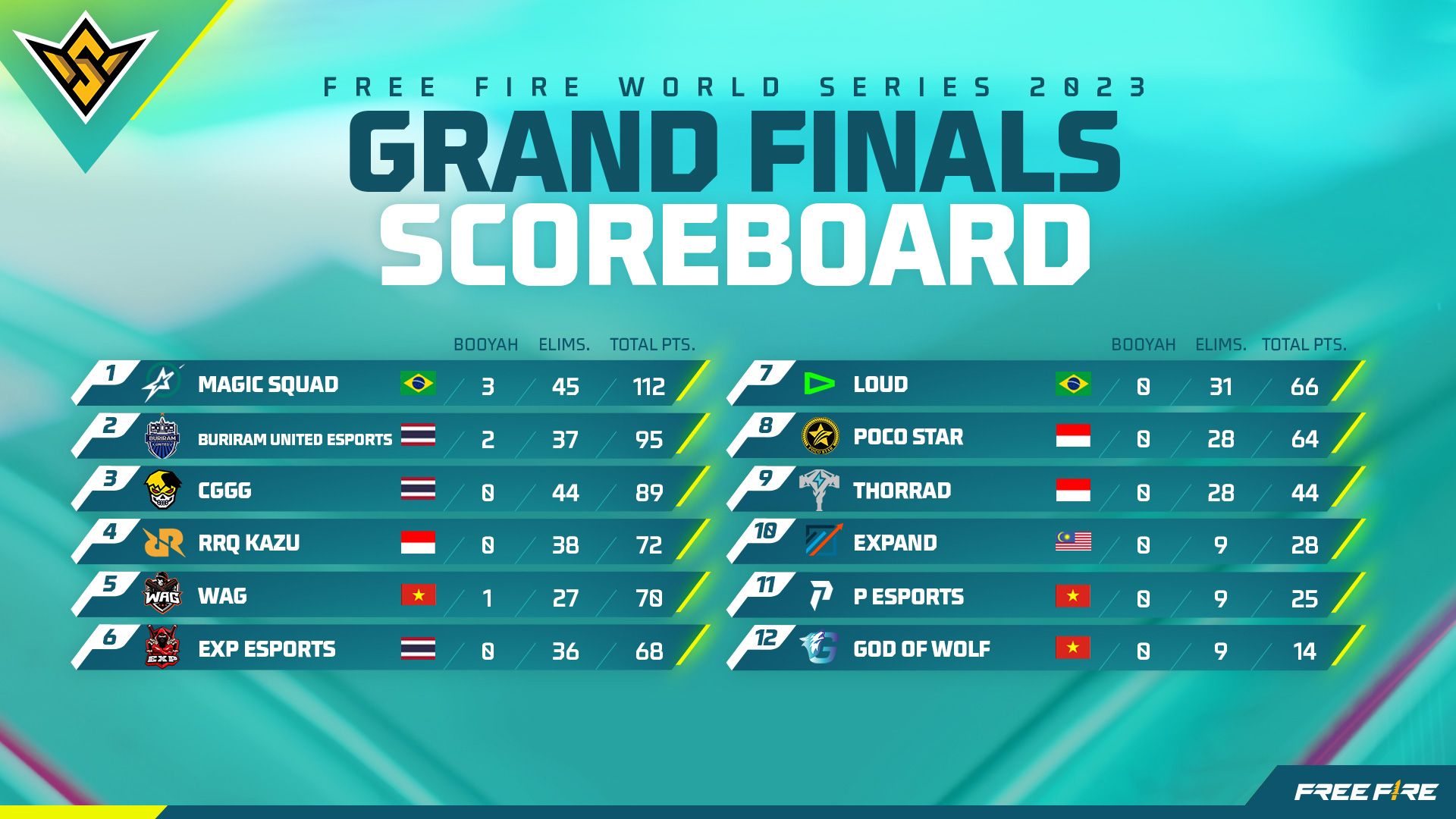 Magic Squad menjadi pemuncak klasemen Grand Finals FFWS 2023 dengan total 112 poin dari 6 ronde pertandingan. Torehan poin tersebut didapatkan dari 45 poin eliminasi, 12 poin headstart (dari babak Point Rush), dan 55 poin placement–termasuk 3 kali Booyah di Grand Finals FFWS 2023. Dengan perolehan tersebut, Magic Squad mampu mengalahkan tim-tim unggulan asal Thailand, seperti Buriram United Esports (95 poin) dan CGGG (89 poin) yang harus puas di peringkat ke-2 dan ke-3 klasemen Grand Finals FFWS 2023.