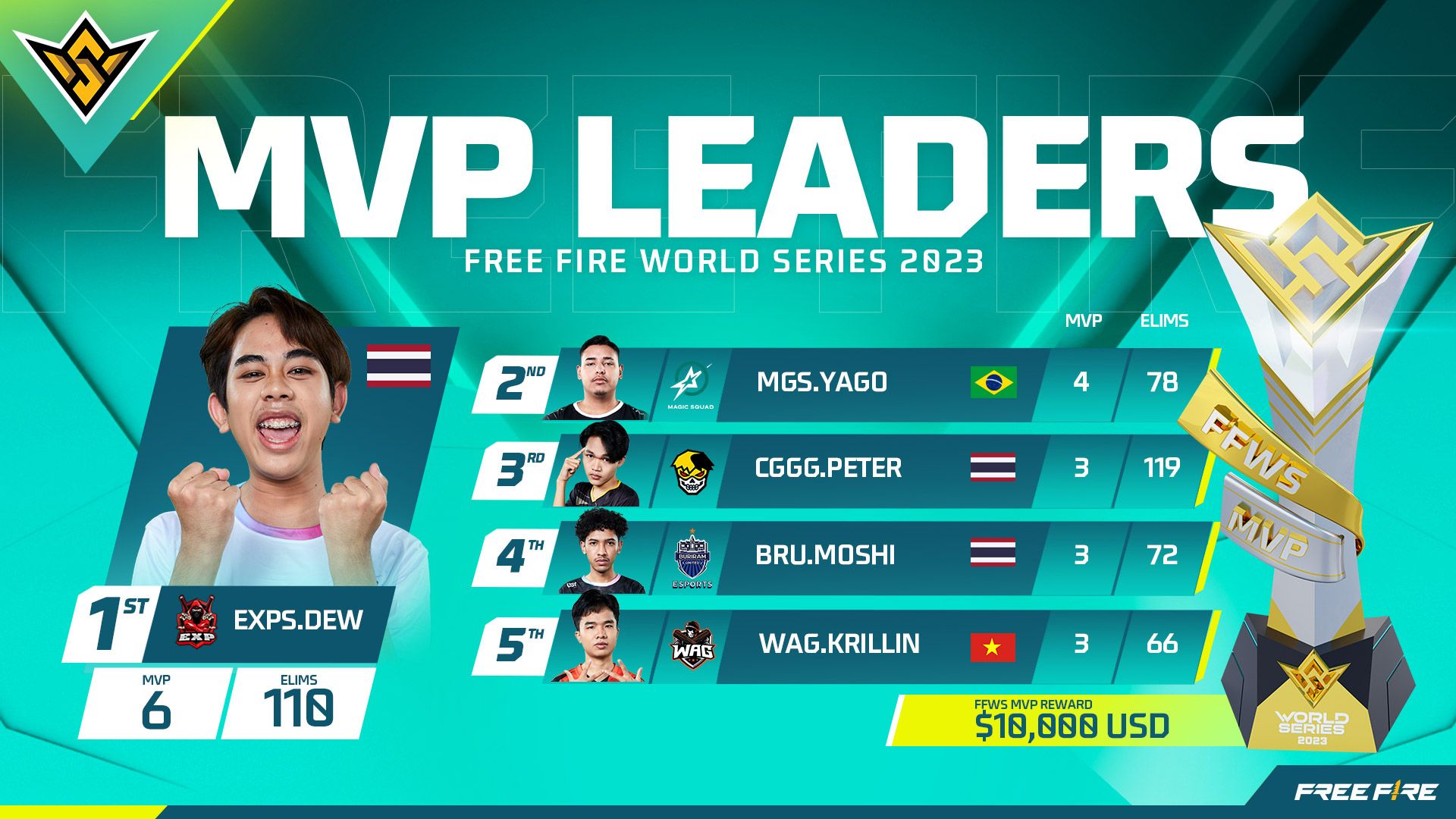 Gelar MVP Free Fire World Series 2023 untuk DEW dari EXP Esports