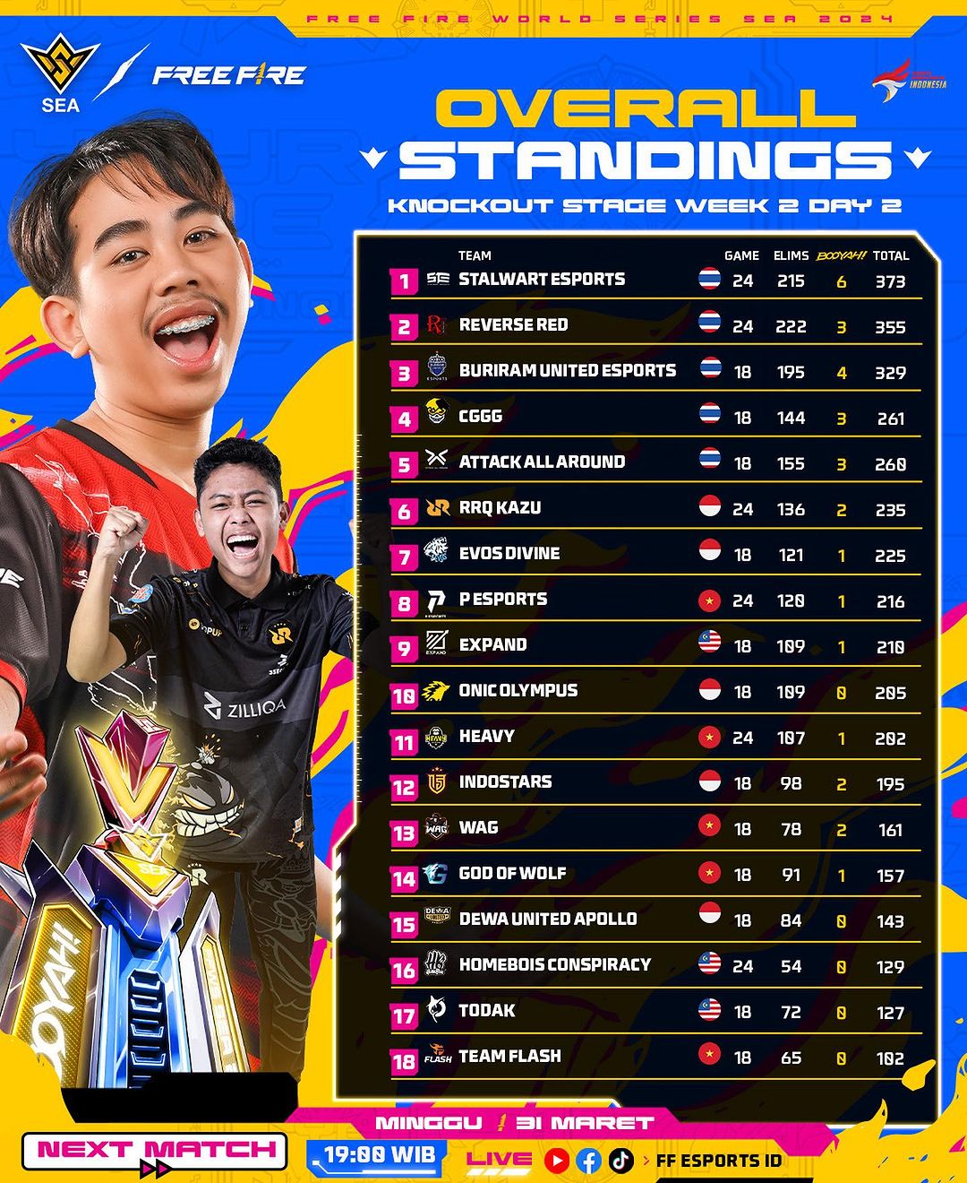 Persaingan tim-tim Indonesia di FFWS SEA 2024 Spring masih berlanjut di matchday 6 di hari Minggu (31/3) ini. Saksikan pertempurannya di channel YouTube, Facebook, dan TikTok FF Esports ID pada pukul 19.00 WIB atau bisa ditonton secara langsung di venue Studio Sepat 72, Pasar Minggu, Jakarta Selatan!