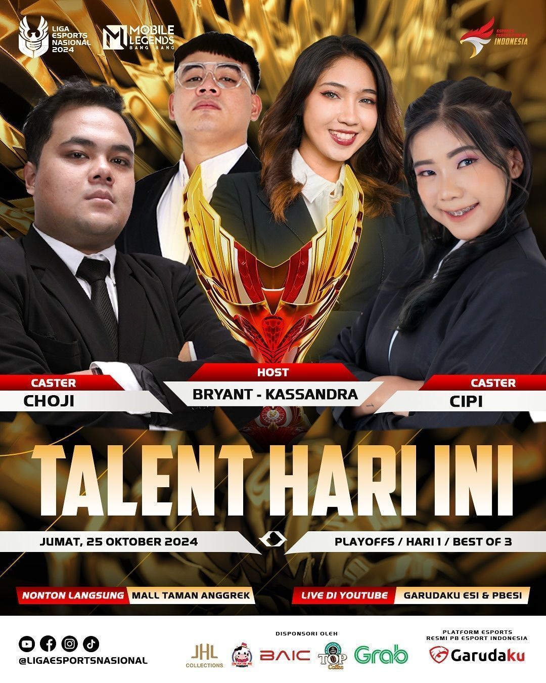 Tidak hanya dari segi pertandingan, ajang playoff ini juga dimeriahkan oleh para talent esports ternama yang akan memandu jalannya pertandingan hari ini. Bryant dan Kassandra hadir sebagai host yang akan memandu acara dengan penuh energi, menghadirkan wawasan mendalam sekaligus suasana yang menghibur bagi para penonton. Keduanya dikenal akan kepiawaian mereka dalam menjaga ritme acara, serta memberikan analisis yang tajam terhadap jalannya pertandingan. Kehadiran mereka akan semakin memperkaya pengalaman menonton, baik bagi penonton yang hadir di venue maupun yang menyaksikan secara daring.