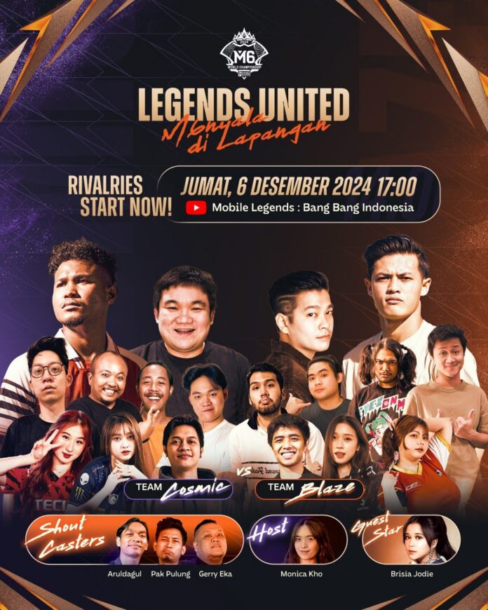Sebagai bagian dari kampanye turnamen dunia M6 World Championship, acara ini memperlihatkan sinergi unik antara dua dunia yang penuh semangat kompetitif, yakni sepak bola dan esports. Acara Legends United: M6nyala di Lapangan juga berhasil menyuguhkan pertandingan spesial antara dua pemain Tim Nasional Indonesia yaitu Alfeandra Dewangga dan Bagus Kahfi bersama beberapa influencer dan legenda esports MLBB, seperti Jonathan Liandi, Donkey, Antimage dan Wann.