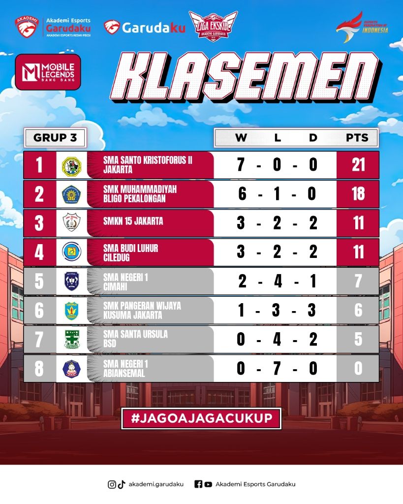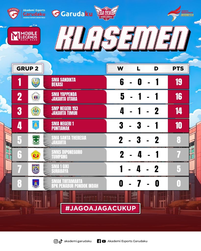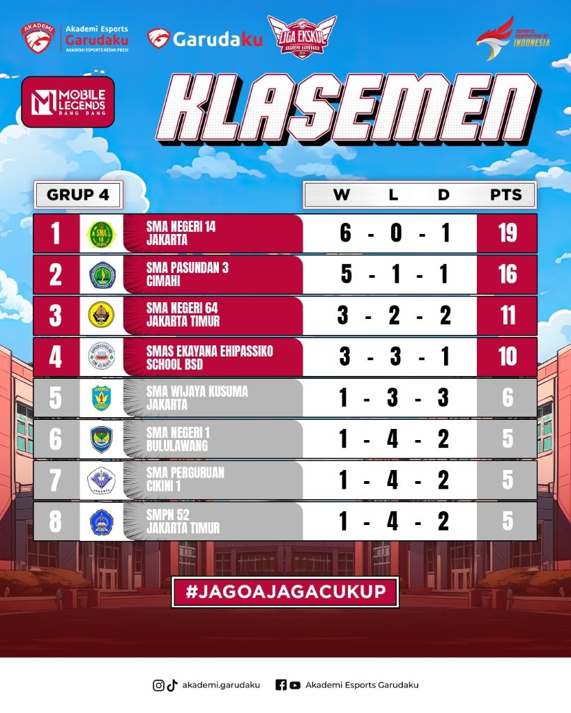 • Derby Jakarta Selatan: SMK Kemala Bhayangkari 1 Jakarta berhasil mengalahkan SMKN 20 Jakarta dengan skor tipis 19-19 (waktu 14:03) setelah pertandingan sengit. SMKN 20 sempat mendominasi di awal, mengamankan turtle 1, 2, dan 3. Namun, SMK Kemala Bhayangkari 1 Jakarta berhasil membalikkan keadaan dan mengamankan lord untuk meraih kemenangan. MVP diraih oleh Fzzan (Cecilion) dari SMK Kemala Bhayangkari 1 Jakarta dengan KDA 6/2/9. Di pertandingan kedua, SMA Kemala Bhayangkari menang telak. MVP diraih oleh anOtherman (Harith) dengan KDA 3/0/5. Skor akhir 2-0 untuk Kemala Bhayangkari.