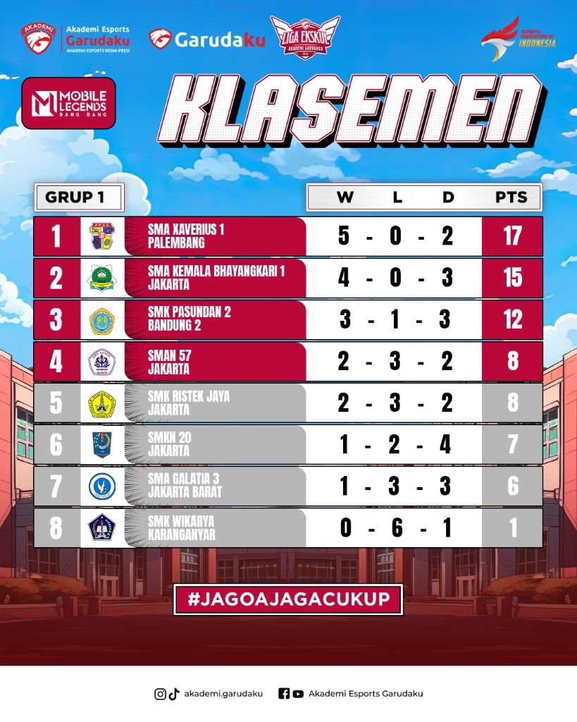 • Clash of Kings: SMA Xaverius 1 Palembang menunjukkan taringnya dengan mengalahkan SMK Ristek Jaya Jakarta 2-0. Meskipun SMK Ristek Jaya sempat memberikan perlawanan, SMA Xaverius 1 Palembang tampil dominan dan mengamankan turtle serta lord. MVP game pertama diraih oleh Phoveus (Xaverius) dengan KDA 4/0/8, dan MVP game kedua diraih oleh Riyezz (Suyou) dengan KDA 7/1/8.