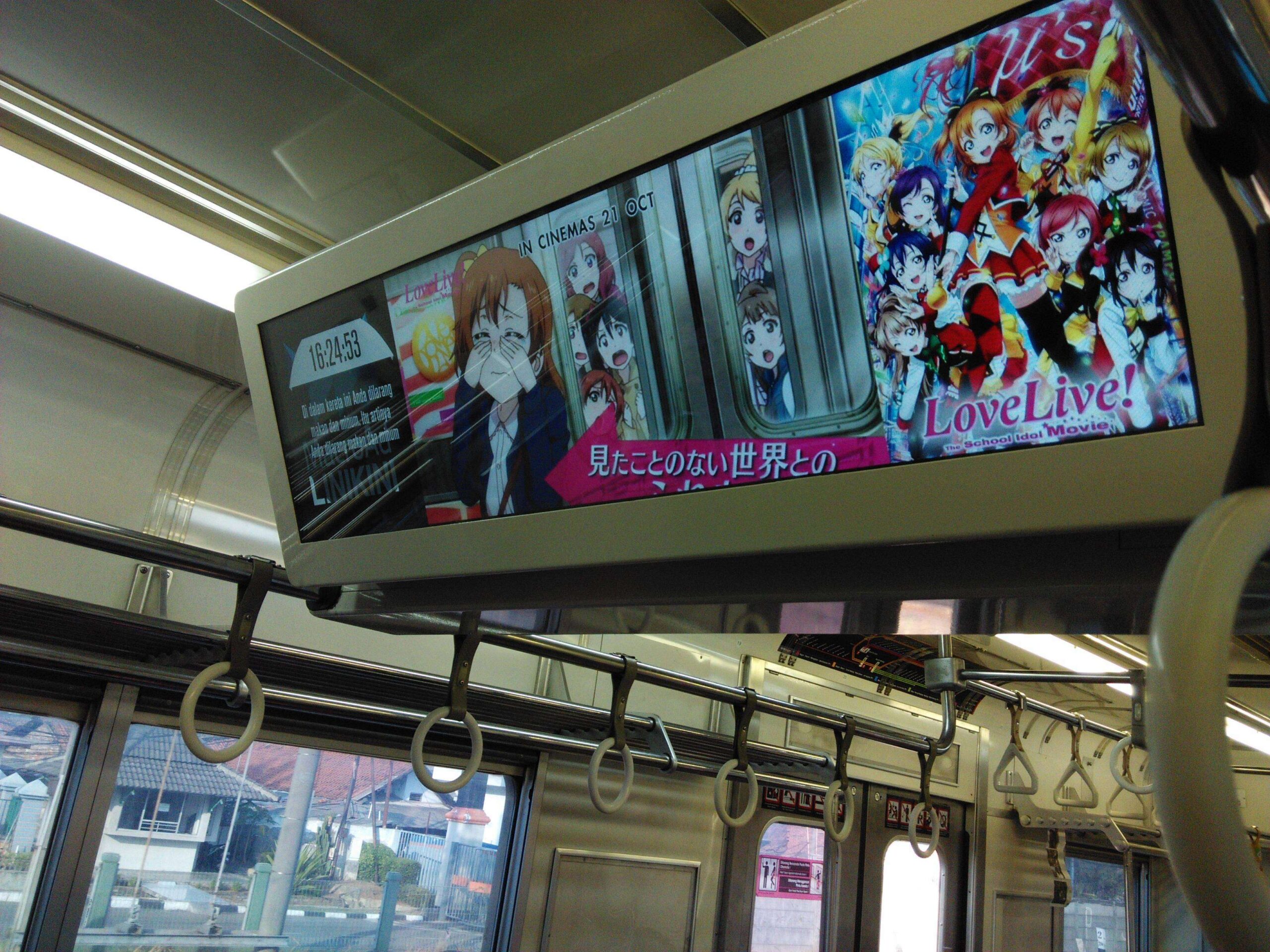 PT KAI Commuter Jabodetabek (KCJ) terus berinovasi. Inovasi yang diberikan dan telah berjalan sejak beberapa bulan lalu adalah fasilitas televisi di dalam rangkaian kereta rel listrik (KRL). Kali ini, ternyata fasilitas ini dimanfaatkan untuk mempromosikan anime Love Live! The School Idol Movie yang mulai tayang pada 21 Oktober.