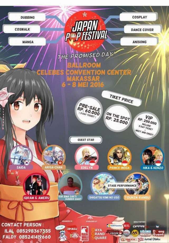 Sebagaimana telah diberitakan sebelumnya, pada tanggal 6-8 Mei akan diselenggarakan acara jejepangan terbesar di Indonesia Timur dengan nama Japan Pop Festival: The Promised Day. Acara ini di persembahkan oleh Cosplayer Makassar Suki (Comasu Cosplay Makassar) yang merupakan salah satu komunitas cosplay terbesar di Makassar dan Sora Merchant serta didukung oleh Daya Grand Square dan Rajawali Media.