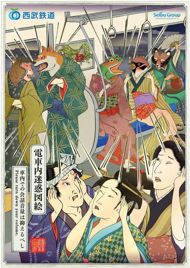 Kali ini giliran Seibu Railway yang mengeluarkan seri manner poster. Bertema gambar bergaya Jepang abad ke-19, poster ini bertema 電車内迷惑図絵 (densha-nai meiwaku zue, gambar-gambar kegiatan mengganggu dalam kereta). Misalnya, poster himbauan duduk ini.