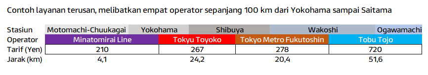 Bila kita berangkat dari stasiun Motomachi-Chuukagai di daerah Yokohama dan hendak bepergian ke stasiun Ogawamachi di Saitama, kita akan melewati empat operator dan masing-masing punya rumus tarif yang berbeda. Tetapi kita tidak perlu ribet membeli tiket masing-masing untuk naik kereta di lintas operator ini. Cukup isi kartu uang elektronik kita, Suica atau Pasmo, dan saat turun di Ogawamachi, kita akan merasa lega telah berhasil menyelesaikan perjalanan yang menantang ini (baik hati dan dompet).