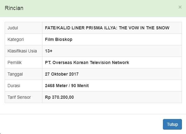 Sebagaimana telah diberitakan sebelumnya, anime Fate/kaleid liner Prisma Illya hadir dalam bentuk film bioskop. Dengan judul Fate/kaleid liner☆Prisma Illya Yukishita no Chikai (Oath Under the Snow), film ini telah diputar di layar bioskop Jepang pada 26 Agustus 2017 lalu.