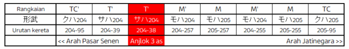 KRL seri 205 eks-East Japan Railway Company (JR East) rangkaian 205-95F yang sementara ini berformasi 8 kereta melayani perjalanan dengan nomor KA 1748. kereta 3 pada rangkaian ini (Tc204-38) keluar dari rel ketika memasuki jalur 5 stasiun Jatinegara.